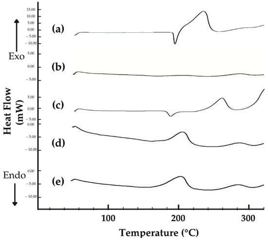 The DSC thermograms of ISN, M-β-CD, their physical mixture (PM), and the ISN/M-β-CD inclusion complexes prepared by freeze-drying (FD) and spray-drying (SD) were analyzed over a temperature range of 50–300 °C at a heating rate of 10 °C/min. Approximately 4 mg of each sample was sealed in an aluminum pan for analysis. The DSC thermograms (Figure 5) provided insights into phase transitions, crystallinity changes, and complex formation [,].