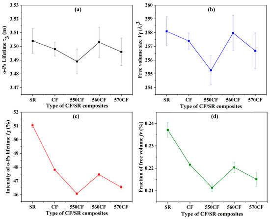 PALS spectra of CF/SR composites: (a) long lifetime (τ3), (b) free volume (Vf), (c) long lifetime intensity (I3), and (d) free volume fraction (fv).