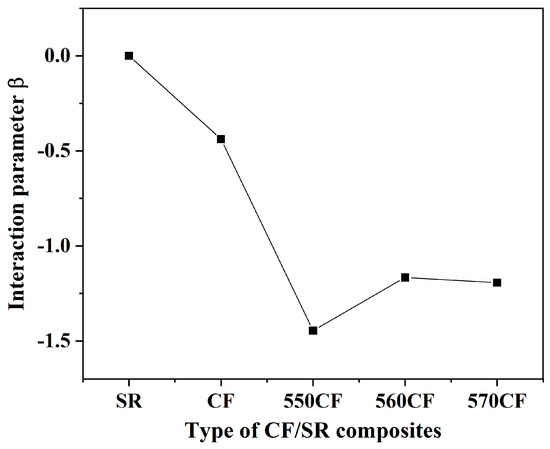 where I2 is the middle lifetime intensity of different CF/SR composites, superscripts of CF and SR refer to the carbon fiber and silicone rubber, and W is the weight percentage of CF. The β of different composites is shown in Figure 4, and the absolute values of β in modified CF-incorporated SR composites is higher than that in raw CR/SR composites. This can be attributed to the big difference in surface characteristics between raw CF and the SR matrix, as well as the aggregation of raw CF [35,38]. The absolute values of β for different CF/SR composites are 550CF/SR (1.45) > 570CF/SR (1.20) > 560CF/SR (1.17) > CF/SR (0.44), revealing the best dispersion of KH-550-modified CF and the strongest interaction between 550CF and the SR matrix, which will significantly enhance the properties of the obtained composites.