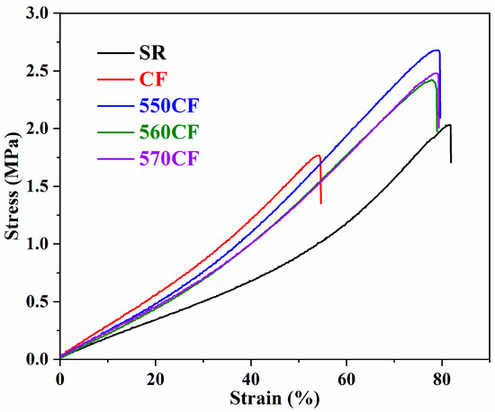 Tensile strength and elongation are important for the mechanical performance of polymer composites, which reveal the highest loading stress and flexibility of the fabricated materials. The stress–strain curves of SR and different SCA-modified CF-filled SR composites are presented in Figure 5.
