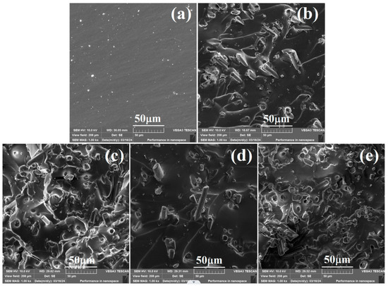 SEM images of the fractured surface of (a) pure SR, (b) CF/SR, (c) 550CF/SR, (d) 560CF/SR, and (e) 550CF/SR composites.