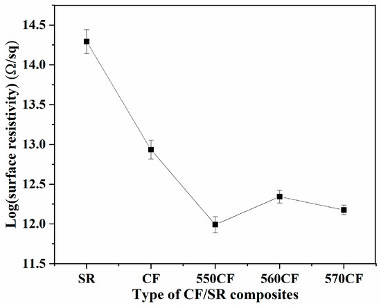 SR-based materials have been widely used in electronic packaging; besides good mechanical performance, the requirement of electronic insulation should also be met [58,59]. The surface resistivity of pure SR and SCA-modified CF-filled SR polymer composites is presented in Figure 7; compared to SR (1.96 × 1014 Ω/◻), the surface resistivity of all CF/SR polymer composites decreased due to the introduction of conductive CF [54,55], and the lowest surface resistivity was obtained for 550CF/SR composite (0.98 × 1012 Ω/◻). Though the resistivity of all CF/SR composites decreased dramatically, there was still no continuous network constructed because the surface resistivity of all CF/SR materials is higher than 1012 Ω/◻; thus, the electrical conductivity was improved through an electron hopping mechanism with non-continuous CF [40,54]. The surface resistivity of different CF/SR composites is ordered as follows: CF/SR > 560CF/SR > 570CF/SR > 550CF/SR, which is consistent with the variation of free volume fraction (fv). This is due to the low fv generating a high-density interfacial region, which is beneficial for the hopping electron in the composite [36,50]. The change rule of surface resistivity of the obtained modified CF/SR composites is also related to the chemical structure of different SCAs, and the amino, epoxy, and vinyl end-groups exhibit different electron densities. The nitrogen atom in the amino group contains a lone pair of electrons, and the vinyl group contains two delocalized π electron, which is beneficial for electron hopping. However, there is no free electron within the epoxy group; thus, the surface resistivity of 560CF/SR is higher than that of 570CF/SR and 550CF/SR.