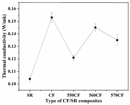 The thermal conductivity of pure SR and all CF/SR polymer composites is presented in Figure 8. SR exhibits a low thermal conductivity of 0.104 W/m·K, which is attributed to the low crystalline degree and severe phonon scattering of the SR matrix. After introducing thermal conductive CF, the thermal conductive performance of all CF/SR composites was improved [40,59]. The highest conductivity (0.153 W/m·K) and the lowest one (0.121 W/m·K) were observed for raw CF/SR and 550CF/SR composites, respectively, which can be attributed to the difference in interface interaction intensity (β). Strong interactions between carbon fibers and SR will induce a high thermal resistance, which can dampen the vibration amplitude and scatter phonons at the interface [50,55]. The strongest β was observed for the 550CF/SR; thus, the highest thermal resistance exists between 550CF and the SR interface, leading to the lowest thermal conductivity of 550CF/SR.