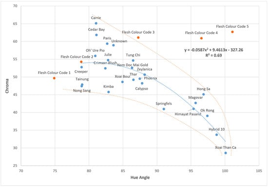 Average flesh hue angle and chroma values of 25 cultivars of fully ripe mangoes (blue circles, n = 6). The comparative values of the five flesh colour cards utilised to categorise the mango colours are shown as orange circles. The above and below orange dotted lines indicate the general spread of the cultivars. A second-order inverse polynomial trend line for all cultivars was further fitted in blue with an equation of y = −0.0587x2 + 9.4613x − 327.26.