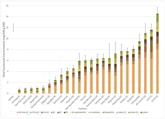 In the cultivars with lower TCC, the proportions and concentrations of all-trans β-carotene displayed similar trends. Despite cv. Ok Rong exhibiting a higher β-carotene proportion of 38.2%, it only had a concentration of 0.196 mg/100 g DW, compared to cv. Xoai Than Ca, which exhibited a proportion of 27.3% and a concentration of 0.215 mg/100 g DW. This was interesting, as the pale-yellow pigmentation exhibited by cv. Xoai Than Ca was likely due to the combination of both the lower orange colouration influenced by the low all-trans β-carotene concentration, but also by the increased concentration of other carotenoids, particularly those with yellow colouration.