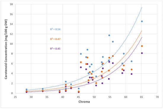 Total carotenoid concentration (TCC) (mg/100 g DW) (blue circles), all-trans β-carotene concentration (mg/100 g DW) (purple circles) and sum of orange carotenoid concentrations (orange circles) of each cultivar against their respective chroma values are indicated. The TCC, orange carotenoids and all-trans β-carotene concentration are the average of six biological replicates.