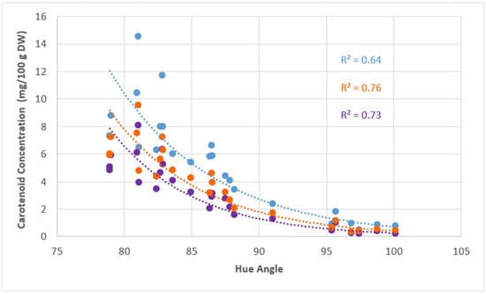The total carotenoid concentration (TCC) (mg/100 g DW) (blue circles), sum of orange carotenoid concentrations (orange circles) and all-trans β-carotene concentration (purple circles), against their respective hue angles are indicated. The sum of orange carotenoids, all-trans β-carotene concentration and TCC are the average of six biological replicates.