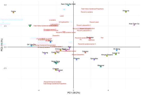 Principal component analysis (PCA) of 25 cultivars of mangoes showing a distribution of samples based on the first two principal components. The 25 cultivars are indicated by differently coloured circles with their respective cultivar names labelled above, whilst the measurement parameters measured in this study are indicated in red.