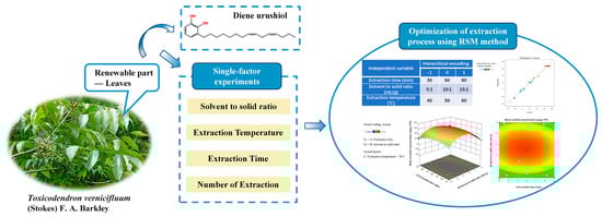Response surface methodology (RSM) is a method that involves experimental design, model establishment, and data analysis to evaluate the interactions between factors across a region and to determine optimal conditions and response values [18,19]. It is commonly used in the extraction studies of plant components [20]. Therefore, this study used the renewable part of lacquer tree leaves as raw materials and optimized the ultrasound-assisted extraction process of diene urushiol using the RSM method, based on single-factor experiments (Figure 1). The purpose of this study is to improve the extraction efficiency of diene urushiol and make full use of lacquer tree plant resources. Ultimately, it lays the foundation for the comprehensive utilization of lacquer trees.