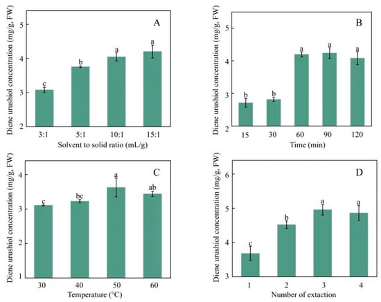 Effects of solvent to solid ratio (A), extraction time (B), extraction temperature (C), and number of extractions (D) on the content of diene urushiol. Different letters indicate the statistical significance at p < 0.05.