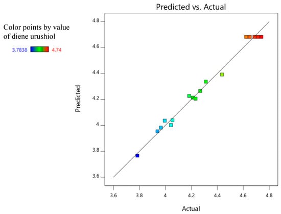 The analysis of variance (ANOVA) was conducted for each factor related to the content of diene urushiol. In Table 3, it can be seen that the model is highly significant (p < 0.0001, f = 62.17), and the lack of fit is not significant (p > 0.05, f = 1.44). It can be observed that the linear terms of the solvent to solid ratio and extraction temperature have a significant effect on the diene urushiol content (p < 0.05). The two-way interaction between extraction time and extraction temperature (p < 0.01) has a greater impact on the diene urushiol content than that between solvent to solid ratio and extraction temperature (p < 0.05). When the interaction of extraction time and temperature is significant (p < 0.01), prolonging the extraction time at a high temperature will exacerbate the degradation phenomenon [34], which is similar to the result found in this study. The quadratic terms of the solvent to solid ratio and extraction temperature have an extremely significant effect on the diene urushiol content (p < 0.0001), and the quadratic term of the extraction time has a highly significant impact on the diene urushiol content (p < 0.01). A higher statistical correlation coefficient (R2 > 0.90) indicates a good fit between experimental values and those obtained by the models [35]. The statistical correlation coefficient R2 is 0.9876 in this study, which is an ideal observation (R2 > 0.90) for the fitted model, proving that the experimental values fit well with the model values. The distribution of actual values approximates a straight line, further confirming the model’s adequacy for predicting and analyzing experimental results in Figure 4.