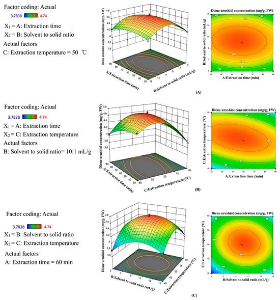 The three-dimensional response surface plot can visually indicate the impact of each variable at different experimental levels and the type of interaction between two variables to determine the optimal conditions for maximizing the response value [36]. Steep curves in the three-dimensional response surface plot indicate significant interactions between the factors, while flat curves suggest that the effects of these factors are not significant [18,19,35]. In Figure 5A, it can be observed that when the solvent to solid ratio is constant, the 3D surface for the extraction time is not steep, indicating that the interaction between solvent to solid ratio and extraction time is not significant. Figure 5B,C show a peak in the 3D surface, with isopleths appearing elliptical. This indicates that the interaction between extraction time and extraction temperature, as well as the interaction between solvent to solid ratio and extraction temperature, has a significant impact on the content of diene urushiol. In Figure 5B, it can be observed that when the temperature varies from 40 to 60 °C, the content of diene urushiol increases and then decreases. This may be due to the increase in molecular diffusion rate with the rising temperature at lower temperatures, but further temperature increases can negatively affect the bioactive substances [37], leading to a decrease in the extraction content of diene urushiol. Additionally, it can be seen from Figure 5C that when the extraction temperature and/or the solvent to solid ratio are low or high, the extraction content of diene urushiol is low. A higher extraction amount of diene urushiol can be obtained only with moderate extraction temperature and solvent to solid ratio. At the same time, it can be observed that the surface steepness on the extraction temperature side is greater than that on the solvent to solid ratio side. This indicates that under the influence of their interaction, the extraction temperature has a greater impact on the extraction content of diene urushiol than the solvent to solid ratio. The results of the above analysis are consistent with the results of the variance analysis.