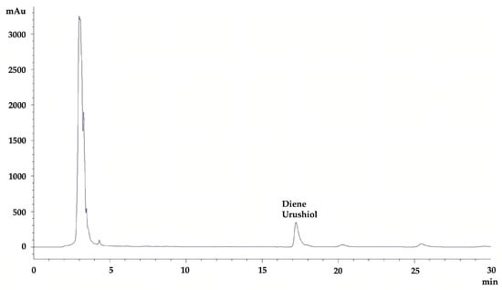 Through Design Expert 11.0 software, the optimal conditions predicted by the model were obtained as follows: extraction time of 55 min, extraction temperature of 51 °C, and solvent to solid ratio of 10.3:1 mL/g. Under these conditions, the predicted content of diene urushiol was 4.69 mg/g, FW. Considering the feasibility of practical operations, the extraction process for diene urushiol was adjusted to an extraction time of 55 min, extraction temperature of 50 °C, and solvent to solid ratio of 10:1 mL/g. Under this extraction process, the content of diene urushiol obtained was 4.56 mg/g, FW, which bore no significant difference compared to the model-predicted value of 4.69 mg/g, FW (RSD of 2.26%). The chromatogram of the sample solution obtained under optimal extraction conditions is presented in Figure 6.