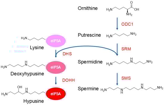 Pathways of polyamine synthesis and hypusination of eIF5A. Hypusination is essential for the activity of eIF5A. ODC1, ornithine decarboxylase 1; SRM, spermidine synthase; SMS, spermine synthase; DHS, deoxyhypusine synthase; DOHH, deoxyhypusine hydroxylase.