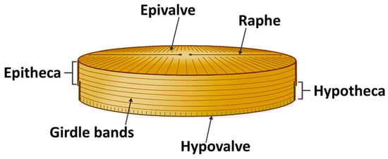 Diatoms are unicellular eukaryotic algae belonging to the class Bacillariophyceae, possessing silica-based cell walls with complex structures [78]. At least 100,000 diatom species exist [79], making them the most copious and varied siliceous marine microorganisms [80]. The word “diatom” is a Greek word that means “cut into two”, whereby in this case the two halves are the epitheca, comprising the epivalve and its copulae (thin bands of silica), and the hypotheca, containing the hypovalve and its copulae, with the appearance compared to that observed in a pillbox or Petri dish (Figure 3). In several species, the valves have multiple layers with each layer typified by distinct porous patterns [81,82]. The silicified cell wall, known as the frustule, differentiates centric diatoms with circular or polygonal valves from pennate diatoms with elongated frustules [83]. An opening or slit in the silica cell wall is called raphe.