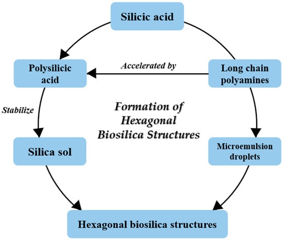 Biosilica from the diatom cell wall contains LCPAs that are attached to putrescine, spermidine, or silaffins [59,76,84]. LCPAs play important roles in the formation and shaping of silica [75,78,87]. A schematic of the formation of hexagonal silica structures in the diatom cell walls according to Sumper [88] and Sumper and Lehmann [78] is shown in Figure 5.