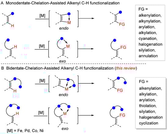 (A) Monodentate-chelation-assisted alkenyl C–H functionalization. (B) Bidentate-chelation-assisted alkenyl C–H functionalization.
