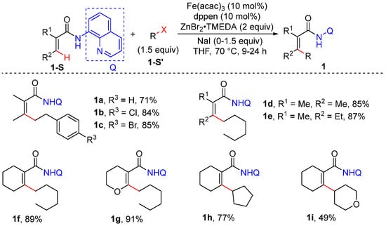 In 2015, Ilies and Nakamura reported the iron-catalyzed alkenyl C–H alkylation of unsubstituted and disubstituted acrylamides bearing an 8-quinolylamide group, using primary and secondary alkylzinc halides generated from Grignard reagent [31]. This reaction introduces Fe(acac)3 and cis-1,2-bis(diphenyl phosphino) ethylene (dppen) as the catalyst and dichloroalkane as the oxidant. Among the 4 equiv. of Grignard reagent required, 3 equiv. is used to generate an organozinc halide, and the remaining 1 equiv. is introduced to deprotonate the amide to facilitate coordination. Among the excess amount of organozinc halide required, 1 equiv. acts as the alkylating reagent and 1 equiv. is used as a base to remove the β-hydrogen of acrylamide (Scheme 3).