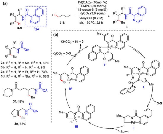 In 2019, Loh and Xu reported the palladium-catalyzed olefinic C–H alkylation of allylamines using primary and secondary alkyl iodides with the assistance of a directing group, isoquinoline-1-carboxamide (IQA) [32]. The frequently used promoters such as (BnO)2PO2H and PivOH do not work efficiently in the reaction. Interestingly, 2,2,6,6-tetramethylpiperidine-1-oxyl (TEMPO) and 18-crown-6(18-Cr-6) significantly improve the reaction efficiency (Scheme 4a). The kinetic isotope effect was determined to be 3.3, showing olefinic C–H activation to be the rate-determining step. The initial reaction rate is determined depending on the concentrations of the catalyst and substrates, suggesting that the palladium catalyst is involved in olefinic C–H activation, and the substrates might not participate in the rate-determining step. A plausible catalytic cycle may be initiated by the generation of complex I’ from Pd(OAc)2 and allylamide, which undergo isomerization to give rise to intermediate I. The following concerted base-assisted metalation−deprotonation occurs to produce intermediate II, which reacts with iodoalkane via oxidative addition to generate a Pd(IV) species III. The reductive elimination of III occurs to produce 3, and the catalyst is regenerated in the presence of K2CO3 and another allylamide (Scheme 4b).