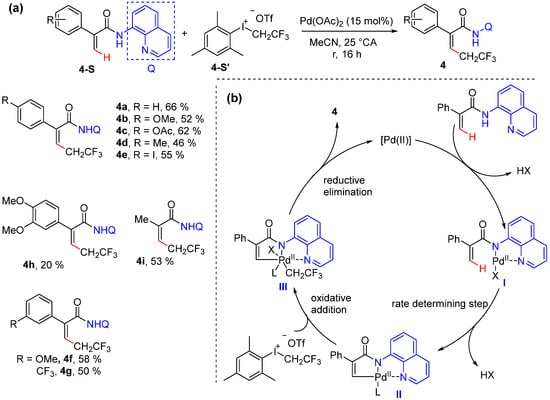 In 2021, Besset’s group reported the Pd-catalyzed 2,2,2-trifluoroethylation of acrylamides bearing an 8-quinolylamide group, which was achieved using a fluorinated hypervalent iodine as a coupling partner [33]. This reaction is simply performed at room temperature without any additive using 15% Pd(OAc)2 in MeCN. Mechanistic experiments ruled out a free radical pathway, as the addition of 3,5-di-tert-4-butylhydroxytoluene (BHT) did not influence the reaction efficiency (Scheme 5a). H/D scrambling experiments and KIE experiments suggested that alkenyl C–H activation is irreversible and probably the rate-determining step. The reaction is proposed to proceed via the coordination of the palladium catalyst to the directing group and the formation of the palladacyle intermediate presumably via a C–H concerted metalation–deprotonation (CMD) process. The subsequent oxidative addition with hypervalent iodine followed by reductive elimination give rise to the desired product and regenerate the catalyst (Scheme 5b).