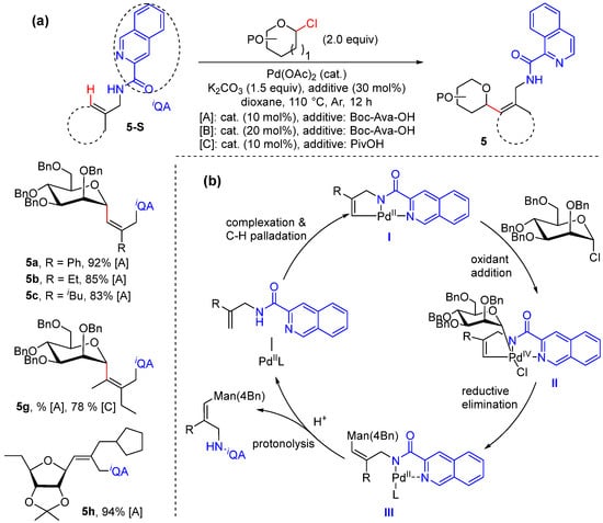 C-vinyl glycosides represent a class of carbohydrates of unique importance. In 2021, He and Chen reported the Pd-catalyzed stereoselective synthesis of C-vinyl glycosides via alkenyl C–H glycosylation using glycosyl chloride donors with chelation assistance provided by auxiliary N,N-bidentate (Scheme 6a) [34]. Both the allylamines and homoallylamine substrates can be converted with high efficiency and have excellent regio- and stereoselectivity. Deuterium-labeled experiments exhibited the C–H palladation step to be reversible and the rate-limiting step. The reaction is proposed to proceed via alkenyl C–H palladation to form the palladacycle intermediate II; oxidative addition with glycosyl chloride to II gives the Pd(IV) intermediate III, which then gives rise to the glycosylated product IV via reductive elimination (Scheme 6b).
