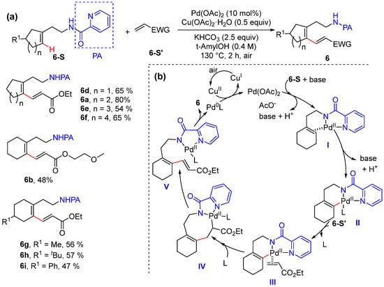 In 2020, He and Cai achieved the palladium-catalyzed alkenyl C–H alkenylation of cycloalkenes using electron-deficient alkenes as coupling partners [35]. The reaction employs Pd(OAc)2 as the catalyst and Cu(OAc)2·H2O as the oxidant to give 1,3-dienes with excellent site- and stereoselectivity, using picolinamide as a bidentate directing group to promote the formation of a unique six-membered alkenyl palladacycle intermediate (Scheme 7a). The reaction exhibits broad substrate scope including five-, six-, seven-, and eight-membered cyclic alkene substrates. A plausible mechanistic cycle starts with the formation of π-alkene palladium complex I, followed by alkenyl C–H activation to produce six-membered palladacycle II. The ligand exchange of the electron-deficient alkene and migratory insertion give intermediate IV, and syn β-H elimination and reductive elimination produce 6 and Pd(0) species, which are converted to catalytically active Pd(II) species via oxidation with Cu(OAc)2·H2O (Scheme 7b).