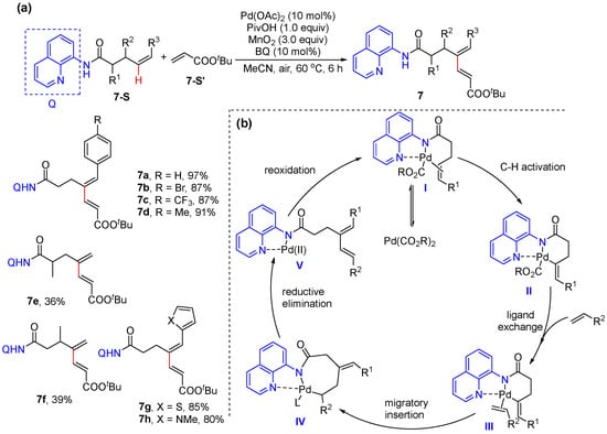 In 2018, Liu and Engle reported the N,N-bidentate-chelation-assisted alkenyl C–H alkenylation of Z-alkenes derived from 4-pentenoic acids, allylic alcohols, and bishomoallylic amines bearing Daugulis’s 8-aminoquinoline (Scheme 8a) [36]. The reaction is performed using 10 mol% Pd(OAc)2 and stoichiometric MnO2 or catalytic Co(OAc)2 under O2. A plausible catalytic cycle was proposed to proceed via alkene coordination to metal to form π-alkene palladium complex I, and the following alkenyl C–H activation occurs to produce six-membered palladacycle II. The subsequent coordination of the electron-deficient alkene and migratory insertion afford eight-membered palladacycle intermediate IV. Finally, β-H elimination and reoxidation of the palladium catalyst by the oxidant give diene product 7 and regenerate the catalytically active species (Scheme 8b).