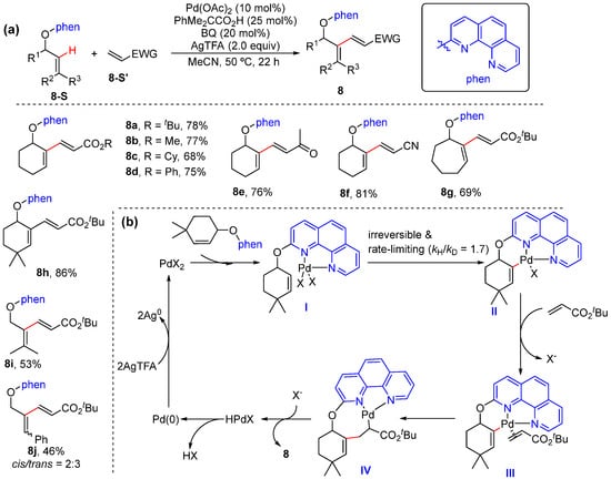 In 2020, Hirano and Miura achieved the Pd-catalyzed alkenyl C–H alkenylation of allylic-alcohol-derived ethers bearing phenanthroline using electron-deficient alkenes (Scheme 9a) [37]. In this transformation, the N,N-bidentate coordinating phenanthroline plays a key role to enable selective alkenyl C–H bond activation and avoid competitive allylic C−O bond activation. The Pd/phenanthroline catalytic system is efficient at alkenyl C–H alkenylation as well as alkynylation. The mechanism is proposed to proceed via the coordination of the phenanthroline moiety to the palladium center, followed by alkenyl C–H cleavage to form 6-membered palladacycle intermediate II. Next, ligand exchange on palladium takes place, followed by olefin insertion and β-H elimination, to afford alkenylation product 8, with the liberation of HX and Pd(0), which undergo reoxidation to complete the catalytic cycle (Scheme 9b). Mechanistic experiments showed the olefinic C–H bond activation to be irreversible and the rate-limiting step. A concerted metalation–deprotonation mechanism was proposed to occur due to the positive effects of acid.