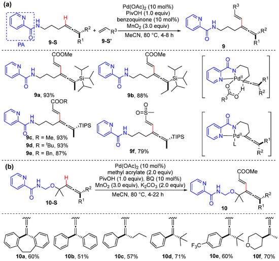 (a) C–H alkenylation of bishomoallenylic picolinamides. (b) C–H alkenylation of allenylic alcohols.