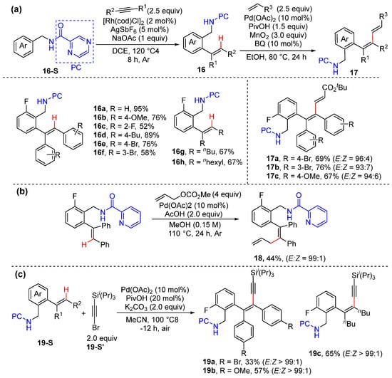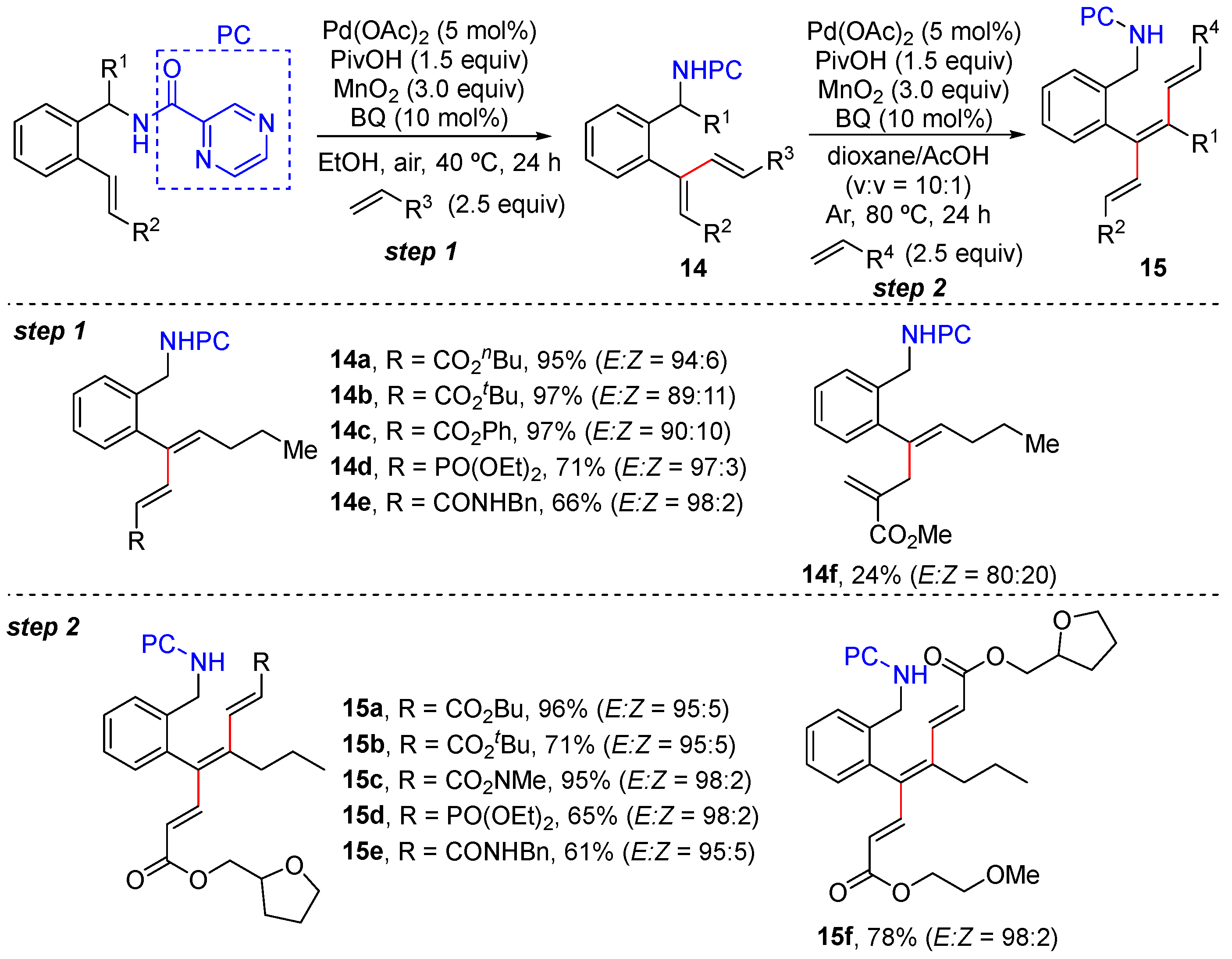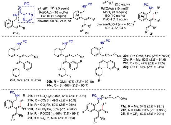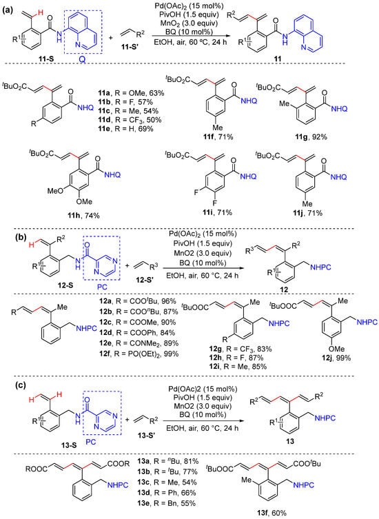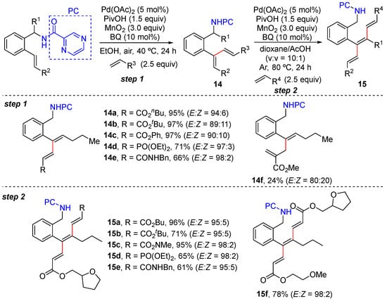 In 2022, Zhong and Zhang reported the N,N-bidentate-chelation-assisted α- and/or β-C–H alkenylation of plain- and α-substituted aryl alkenes to give aryl dienes and trienes with excellent site- and stereoselectivity (Scheme 11a–c) [39]. This method employs 2-alkenyl benzylamine and benzoic acid derivatives bearing Daugulis’s 8-aminoquinoline (AQ) and 2-pyrazinamide (PC) as substrates, which is performed using a combination of a catalytic amount of Pd(OAc)2 and benzoquinone (BQ), a quantitative amount of MnO2 as the oxidant, and PivOH as the additive in ethanol. Interestingly, plain 2-vinyl benzamides bearing 8-aminoquinoline (AQ) only lead to α-C–H alkenylation (Scheme 11a); however, α,β-bis C–H alkenylation takes place smoothly to produce 1,3,5-trienes if plain 2-vinyl benzamides bearing 2-pyrazinamide (PC) are used as the substrates instead (Scheme 11c). The reactions are proposed to proceed via six-membered exo-cyclopalladation and seven-membered endo-cyclopalladation.