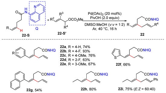 In 2019, Zhong and Zhang achieved the alkenyl C–H allylation of inactivated (Z)-alkene and allyl carbonates, which was simply performed using 20 mol% Pd(OAc)2 and 2 equivalents pf PivOH in mixed DMSO/MeOH (v/v 1:2) under argon [43]. Different allylation reagents were examined. While allyl alcohol, allyl iodide, and allyl phosphate showed significantly lower reactivity, the other allyl carboxylic esters led to moderate yield with undesired double-bond migration products. A kinetic isotope effect (KIE) value of 2.6 was determined via an intermolecular competition experiment, suggesting alkenyl C–H cleavage to be the rate-determining step. The 8-aminoquinolin amide group can be conveniently removed under Ohshima’s methanolysis conditions via nickel catalysis to produce ester in good yields (Scheme 15).