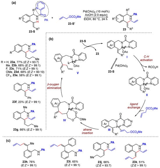 Very recently, the same group also achieved the first α- and β-C–H allylation of aryl alkenes to prepare linear and branched 1,4-dienes using allyl carbonates as the allylation reagents [44]. The C–H allylation reaction is enabled by pyridine-2-carboxamide as the directing group, which is performed using Pd(OAc)2 as the catalyst an AcOH as the promoter in ethanol (Scheme 16a). This protocol can be applied to a broad substrate scope such as E- and Z-configurated aryl alkenes, plain styrene, as well as α-substituted styrenes. The mechanism includes the coordination between substrate and palladium, C–H activation to form six-membered palladacycle II, ligand exchange and alkene insertion with allyl carbonate, and β-oxygen elimination to produce 1,4-diene 23 (Scheme 16b). This protocol is also successfully applied to β-C–H allylation of aryl alkenes (Scheme 16c).