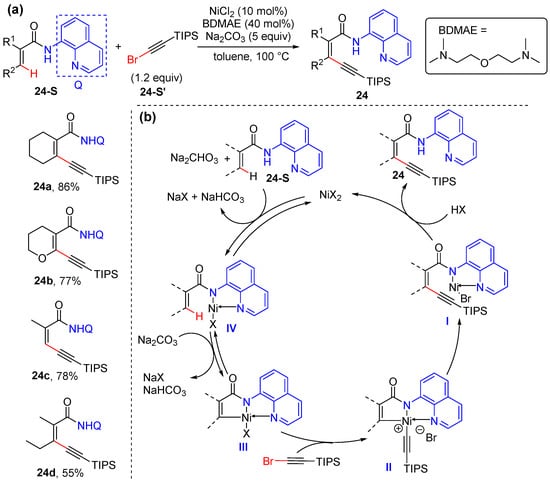 In 2015, Li’s group developed a process for the efficient nickel-catalyzed alkenyl C–H alkynylation of acrylamides with the directing assistance of 8-aminoquinoline [45]. Acyclic and cyclic acrylamides are both tolerated, as well as mono- and disubstituted ones. A simple salt NiCl2 (10 mol%) and bis(2-dimethylaminoethyl) ether (BDMAE) (40 mol%) are used to catalyze the reaction, using 5 equivalents of Na2CO3 in toluene, and the catalytic conditions were also successfully applied for aromatic C–H alkynylation (Scheme 17a). The directing group is readily removed to give aldehyde or ester in high yields. The possible mechanism starts with the coordination of amide to the nickel catalyst, followed by ligand exchange and then C–H cyclometallation, to give five-membered metallocycle intermediate II. Subsequently, the oxidative addition of bromoalkyne produces high-valent Ni(IV) species III, which undergoes reductive elimination and protonation to yield 1,3-eneyne 24 and liberates the Ni(II) catalyst (Scheme 17b).