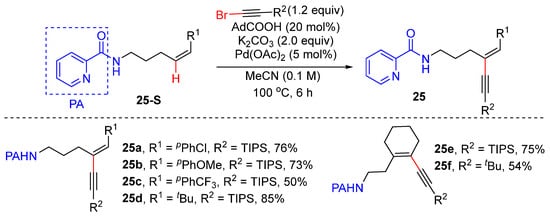In 2020, Carreira’s group achieved the Pd-catalyzed regio- and E/Z-selective alkenyl C–H alkynylation of electronically unbiased Z-alkenes with bromoalkynes to produce 1,3-eneyne 25 [46]. A picolinamide directing group was used to enable the formation of putative five and six-membered exo-palladacycle. Alkenyl C–H alkynylation was successfully achieved by using 5 mol% Pd(OAc)2, 2 equivalents of K2CO3, and 20 mol% pivalic acid in MeCN as the solvent. The picolinamide directing group was readily removed by treating with Zn/HCl to produce free amine (Scheme 18).