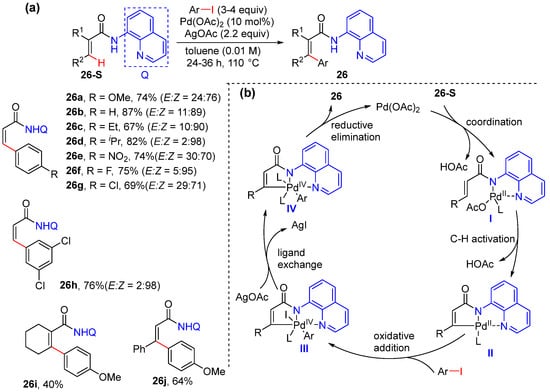 In 2015, Babu’s group reported the Pd-catalyzed alkenyl C–H arylation using Pd(OAc)2 as the catalyst and AgOAc as the promoter in toluene as the solvent [47]. In the presence of 4 equivalents of aryl- and heteroaryl iodides, the arylation reaction proceeded smoothly to produce a Z-selective product with moderate to excellent E/Z selectivity (Scheme 19a). The reaction was proposed to start with N,N-bidentate coordination of the N-(quinolin-8-yl)acrylamide to palladium, followed by alkenyl C–H activation, to afford five-membered palladacycle intermediate II. Oxidative addition of II with ArI delivers Pd(IV) species III, and the final reductive elimination of the Pd(IV) species produces the desired aryl alkene 26 (Scheme 19b).