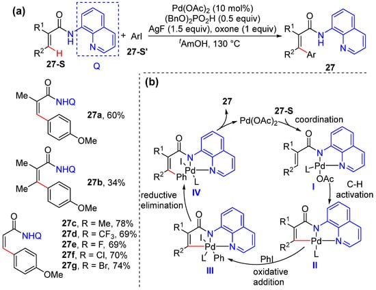 Xue and Jiang reported a similar method for Pd-catalyzed vinylic C–H bond arylation using aryl iodides under the assistance of aminoquinoline groups [48]. This reaction was performed using 10 mol% Pd(OAc)2, 1.5 equivalents of AgF, 0.5 equivalents of (BnO)2PO2H, and 1.0 equivalent of oxone (Scheme 20a). The conditions were successfully applied to mono-, di-, and unsubstituted acrylamides. A Pd(II)/Pd(IV) catalytic cycle was proposed including C–H cyclometallation via directed olefinic C–H activation, the oxidative addition of aryl iodide to form Pd(IV) complexes, and reductive elimination and ligand exchange to liberate product 27. Also, the electronic properties of aryl iodides have little effect on reactivity, which was confirmed by intermolecular competition experiments (Scheme 20b).