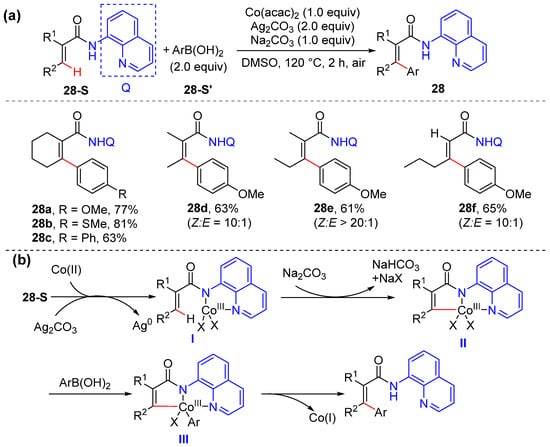 Tan and Zhu achieved the cobalt-promoted arylation of olefinic and aryl C–H bonds with aryl boronic acids by using 8-aminoquinoline as the directing group [49]. The reaction tolerates a wide range of functional groups and can be applied with diversely substituted substrates (Scheme 21a). A plausible mechanism including Co(II)–Co(III)–Co(I) starts with the oxidation of Co(II) to Co(III) by Ag2CO3 and ligand exchange to give intermediate I, which undergoes olefinic C–H activation to form five-membered alkenyl Co(III) species II. The subsequent trans-metallation of II with phenylboronic acid occurs to produce cobalt complex III, and the final reductive elimination of the Co(III)–complex III delivers the desired product 28. However, the Co(II)−Co(IV)−Co(II) mechanistic cycle is also possible (Scheme 21b).