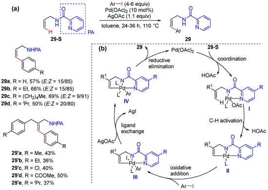 In 2017, Babu’s group reported the picolinamide-assisted olefinic C–H arylation of N-allyl picolinamides, achieved using various aryl iodides under palladium catalysis [50]. This reaction was simply performed in the presence of the catalyst Pd(OAc)2 and additive AgOAc in toluene, affording cinnamylamines with moderate to good yields and good to excellent E/Z ratios (Scheme 22a). If the allyl substrate contains both γ-C(sp2)−H and γ-C(sp3)−H bonds, C–H arylation takes place at both γ-C(sp2)−H and γ-C(sp3)−H to give bis-arylated cinnamylamines. A Pd(II)−Pd(IV) catalytic cycle was also proposed, as shown in Scheme 22. AgOAc is used to promote the ligand-exchange step to regenerate the catalytically active Pd(II) species (Scheme 22b).