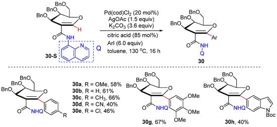 In 2019, Ferry’s group reported a N,N-bidentate-chelation-assisted palladium-catalyzed olefinic C–H arylation of C2-amido glycals onto the anomeric position, affording a novel route to C-aryl/alkenyl glycosides [51]. An aminoquinoline-type directing group was introduced to successfully introduce diverse (hetero)aryl and alkenyl groups at C 1 of the sugar. The protocol is also successfully applied to the synthesis of a dapagliflozin analogue. Alkenyl iodides could also be successfully reacted to afford alkenylation products (Scheme 23).