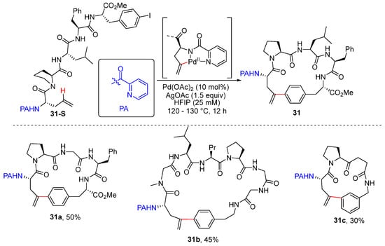 Chen and co-workers achieved Pd-catalyzed and picolinamide (PA)-directed intramolecular olefinic C–H arylation using aryl iodides, producing elegant constructions of olefinic and aromatic C-linked cyclophane peptide macrocycles [52]. This protocol is also applicable for intramolecular aromatic C–H arylation. This reaction provides an efficient approach for the preparation of cyclophane-braced structures from easily obtained linear peptide precursors. Notably, the PA group is readily removed by treatment with Zn powder in diluted aqueous HCl (1.5 M) and THF at room temperature to give rise to NH-Fmoc groups (Scheme 24).