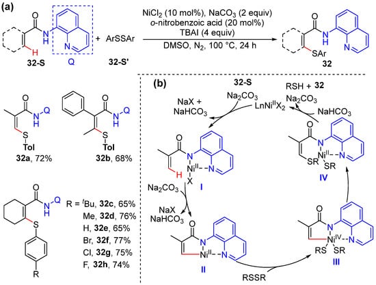 Zhang and co-workers developed a process for nickel-catalyzed aromatic and alkenyl C–H thiolation with diaryl disulfides, using 8-aminoquinoline as the directing group. The protocol exhibits a broad functionality tolerance and substrate scope (Scheme 25a) [53]. The addition of 2,2,6,6-tetramethyl-1-piperidinyloxy (TEMPO) under the standard reaction conditions does not influence the reaction, and this result excludes the possibility of a radical-involved Ni(I)/Ni(III) pathway. A tentative mechanism based on Ni(II)/Ni(IV) cycle was proposed to proceed via an auxiliary 8-aminoquinolyl enabling alkenyl C–H activation to form a five-membered nickelacycle II, with the subsequent oxidative addition of disulfide into Ni(II) species II and the reductive elimination form the C–S bond. The final ion exchange and protonation produce thiolation product 32 (Scheme 25b).