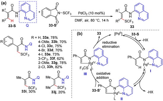 Bouillon and Besset achieved the Pd-catalyzed stereoselective trifluoromethyl thiolation of acrylamides using Munavalli reagent 30-S’ as the electrophilic SCF3 source [54]. The transformation is also enabled by the chelation assistance of 8-aminoquinoline as the directing group, being simply performed using 10mol% of PdCl2 as the catalyst in DMF (Scheme 26a). A broad range of α- and/or β-substituted acrylamides can be smoothly converted to produce specific SCF3 substituted alkenes with excellent regio- and stereoselectivity. The reaction is proposed to proceed via the coordination of a bidentate directing group to the Pd catalyst and then C–H cyclometallation via reversible C–H activation to produce II. Next, the oxidative addition between II and the electrophilic SCF3 source occurs to give rise to a putative Pd(IV) species, which undergo reductive elimination to produce 33 and regenerate the catalyst (Scheme 26b).
