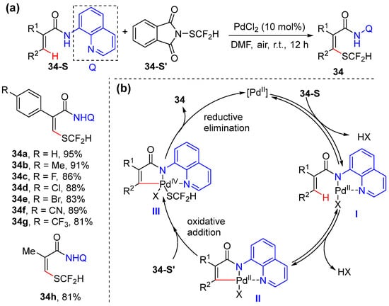 Pan and He reported the palladium-catalyzed difluoromethyl thiolation of acrylamides, using 8-aminoquinoline as a directing group [55]. The reaction conditions are similar to Bouillon and Besset’s conditions [54]; the reaction is simply performed with 10 mol% PdCl2 in DMF at room temperature to access specific SCF2H-containing olefin skeletons using Shen’s difluoromethyl thiolation reagent 34-S’ (Scheme 27a). The mechanism includes the coordination of the bidentate directing group to the Pd(II) catalyst; olefinic C–H activation to give palladacycle intermediate II, which undergoes oxidative addition with difluoromethyl thiolation reagent to form Pd(IV) species III; and the reductive elimination of III to yield difluoromethyl thiolation product 34 with the release of the catalyst (Scheme 27b).