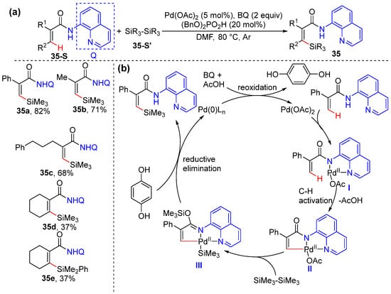 - Pan, J.L.; Chen, C.; Ma, Z.G.; Zhou, J.; Wang, L.R.; Zhang, S.Y. Stereoselective Synthesis of Z-Vinylsilanes via Palladium-Catalyzed Direct Intermolecular Silylation of C(sp2)–H Bonds. Org. Lett. 2017, 19, 5216–5219. [Google Scholar] [CrossRef] [PubMed]