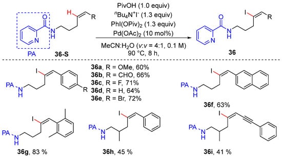 - Schreib, B.S.; Carreira, E.M. Palladium-Catalyzed Regioselective C–H Iodination of Unactivated Alkenes. J. Am. Chem. Soc. 2019, 141, 8758–8763. [Google Scholar] [CrossRef] [PubMed]