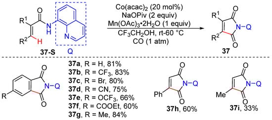 In 2014, Daugulis’s group reported the preparation of cyclic imides from acrylamides via aminoquinoline-directed olefinic C–H carbonylation/cyclization [58]. This reaction is performed with 20 mol% Co(acac)2, 2 equivalents of NaOPiv, 1 equivalent of Mn(OAc)3•2H2O under 1 atm CO in trifluoroethanol. Many functionalities such as CF3, CN, CO2Et, OCF3, and Br are tolerated by this protocol (Scheme 30).