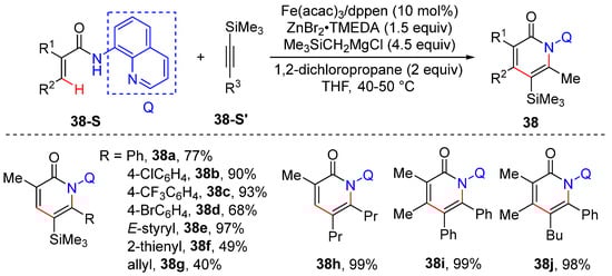 In 2017, Nakamura and Ilies developed a method of iron-catalyzed C–H bond cleavage and C−N bond formation to yield 2-pyridone 38 and isoquinolones from arylamides and internal alkynes [59]. Unsymmetrical alkynes also produce the pyridone derivative with high regioselectivity, presumably due to the sensitivity of the iron catalyst to the reaction’s steric effects. The transformation is performed using Fe(acac)3 as a catalyst, cis-1,2-bis(diphenylphosphino) ethylene (dppen) as a ligand, bis(trimethylsilylmethyl)zinc as a base, and 1,2-dichloropropane as an oxidant. The reaction shows no formation of byproducts such as the coupling of acrylamides and silylmethyl anion or the homocoupling of the silylmethyl reagent (Scheme 31).