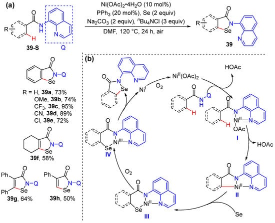 Nishihara and coworkers developed a method for the Ni-catalyzed direct selenation/cyclization of acrylamides and benzamides bearing an auxiliary 8-quinolyl using elemental selenium to produce benzoisoselenazolone 39 under aerobic conditions (Scheme 32a) [60]. The reaction proceeds in the presence of Ni(OAc)2· 4H2O and PPh3 as the catalyst, Na2CO3, and Bu4NCl in DMF under atmospheric air. The addition of Bu4NCl is required presumably due to its aiding in dissolving the elemental selenium in organic solvents. A possible mechanism is proposed to be initiated by a base-promoted ligand exchange between the nickel (II) catalyst and the substrate, which then undergoes C–H activation to produce a nickelacycle intermediate. The insertion of elemental selenium into a carbon−nickel bond forms intermediate III, which undergoes aerobic oxidation to produce cyclic nickel (III) species IV. A final reductive elimination delivers the nickel (I) complex and the product 39. The nickel (I) complex is converted to nickel (II) species by oxidation in air (Scheme 32b).