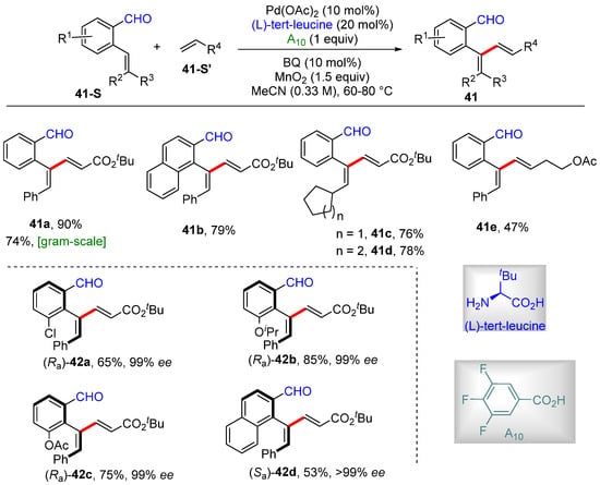 Zhong and Zhang achieved the Pd-catalyzed atroposelective β-olefinic C–H alkenylation of aryl alkene under N,O-bidentate chelation assistance [61]. This protocol introduces aldehyde- and amino-acid-derived transient chiral auxiliaries, which is proceeded by seven-membered endo-cyclometallation 40-Int, producing axially chiral aryl 1,3-dienes bearing aldehyde in up to 99% yields and with excellent enantioselectivities (up to >99% ee). The products are oxidized to produce axially chiral carboxylic acid without erosion of enantioselectivity, which were successfully used as chiral ligands in Co(III)-catalyzed asymmetric 1,4-addition reactions (Scheme 33).