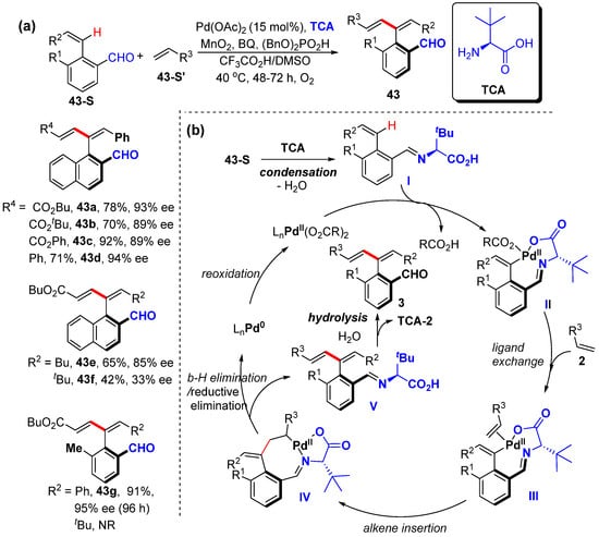 After advances in the asymmetric β-C–H functionalization of styrenes [61], Zhong and Zhang also reported the asymmetric α-C–H alkenylation of aryl alkenes to prepare axially chiral aryl 1,3-diene (Scheme 35a) [63]. This protocol is also assisted by an aldehyde/L-t-leucine-derived transient chiral auxiliary, which is performed using Pd(OAc)2 as the catalyst, amino acid as the transient chiral auxiliary (TCA), 1.5 equivalents of MnO2 and BQ as the oxidants, and (BnO)2PO2H as an additive in mixed HOAc/DMSO under an O2 atmosphere, affording excellent enantioselectivity. Also, axially chiral aryl carboxylic acids are obtained from axially chiral aryl dienes via simple oxidation with NaClO2/NaH2PO4, which are used in the asymmetric 1,4-addition of indole with maleimide under Co(III) catalysis. A plausible mechanism is proposed to start with condensation between aldehyde and amino acid TCA to afford imine I, which coordinates with palladium species and undergoes C–H activation to generate a six-membered exo-palladacycle II. Ligand exchange and alkene insertion produce eight-membered exo-palladacycle IV. β-H elimination and imine hydrolysis produce axially chiral styrene 43 and regenerate amino acid TCA. The reductive elimination and reoxidation of the Pd0 species regenerate active Pd(II) species to enter the next catalytic cycle (Scheme 35b).